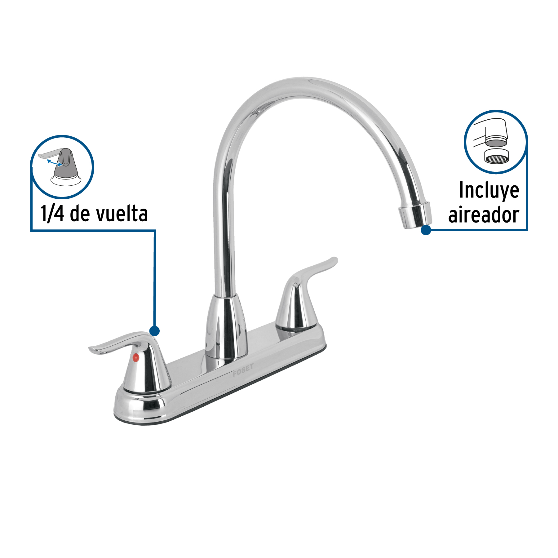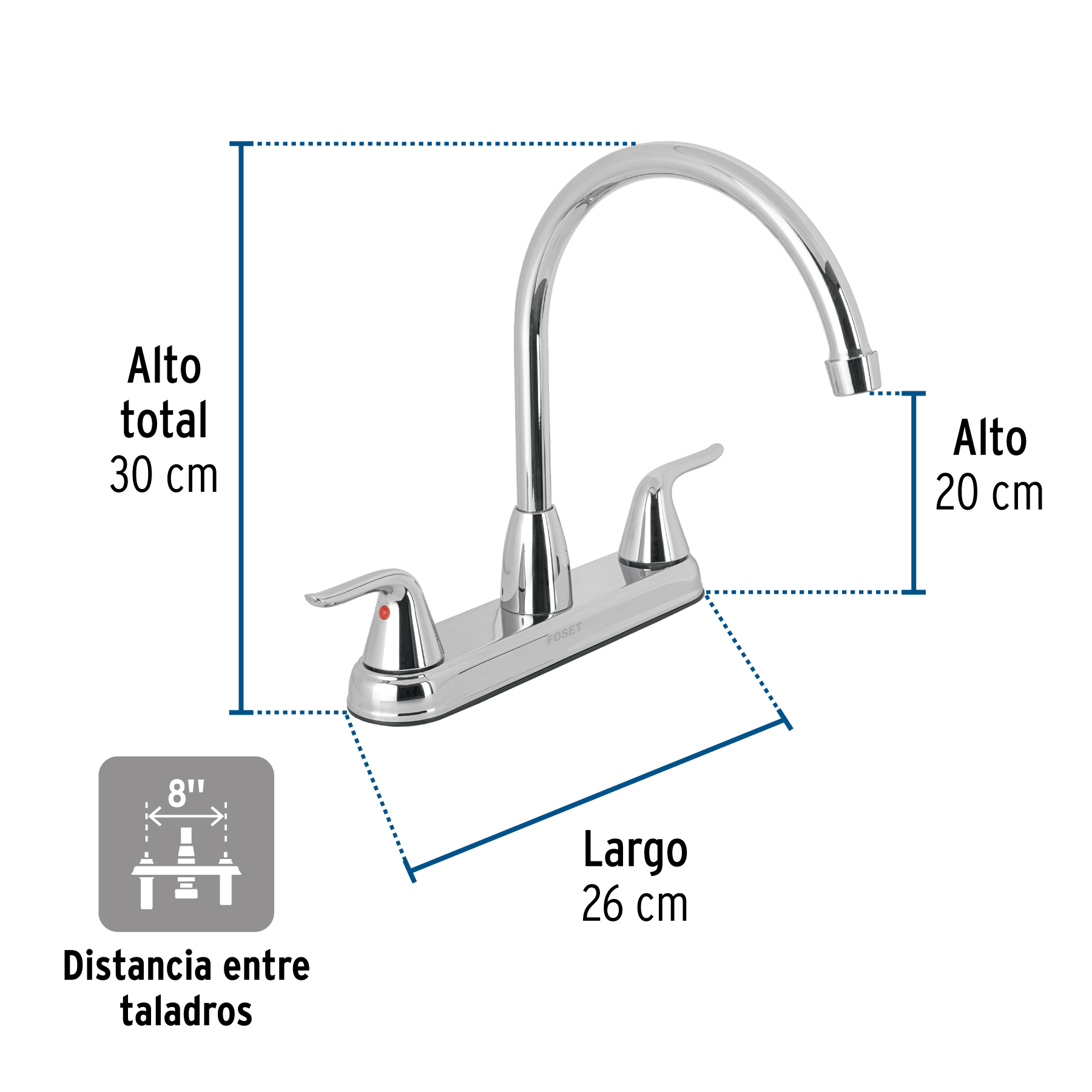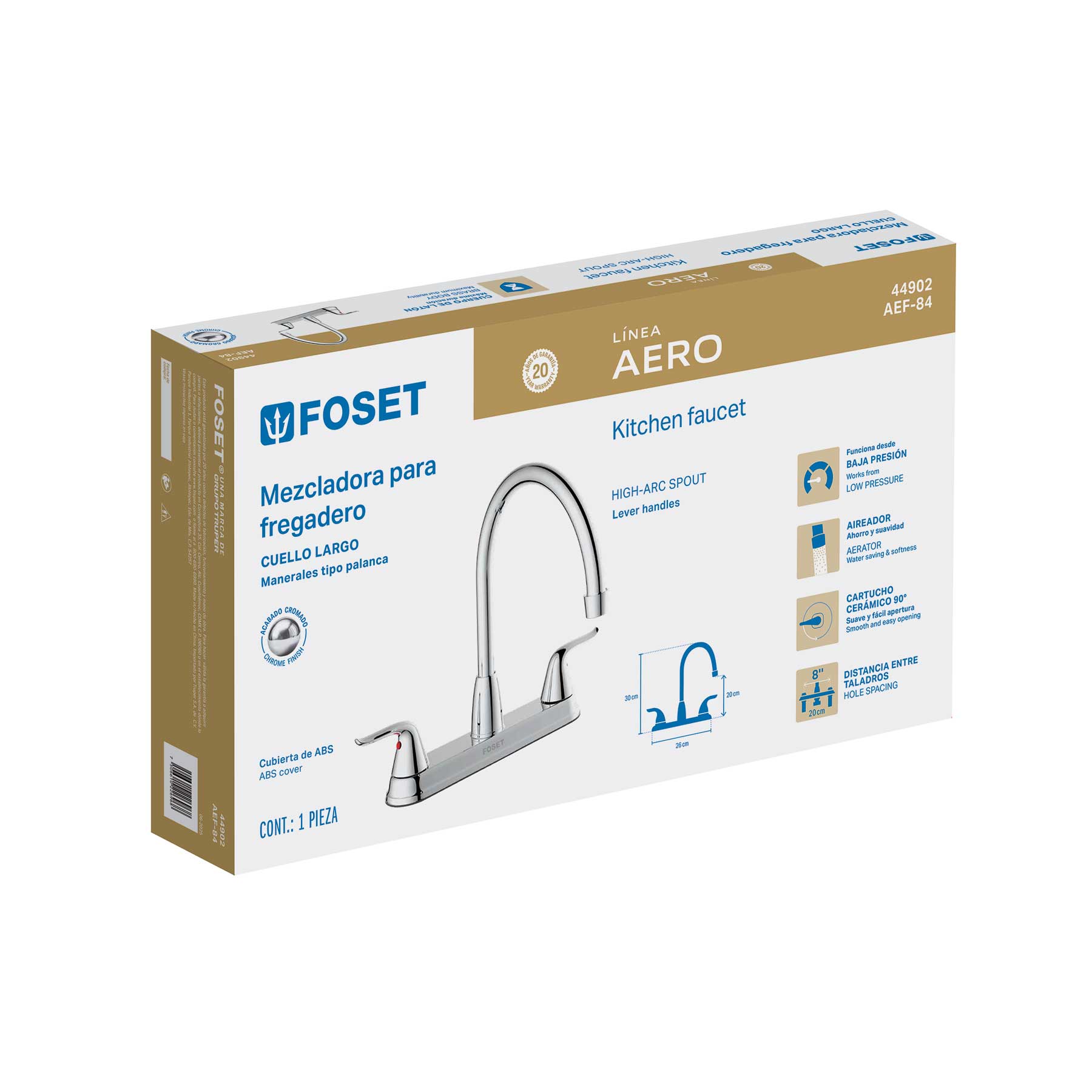 44902 Mezcladora fregadero 8″ cromo, c. largo, palanca, FOSET AERO