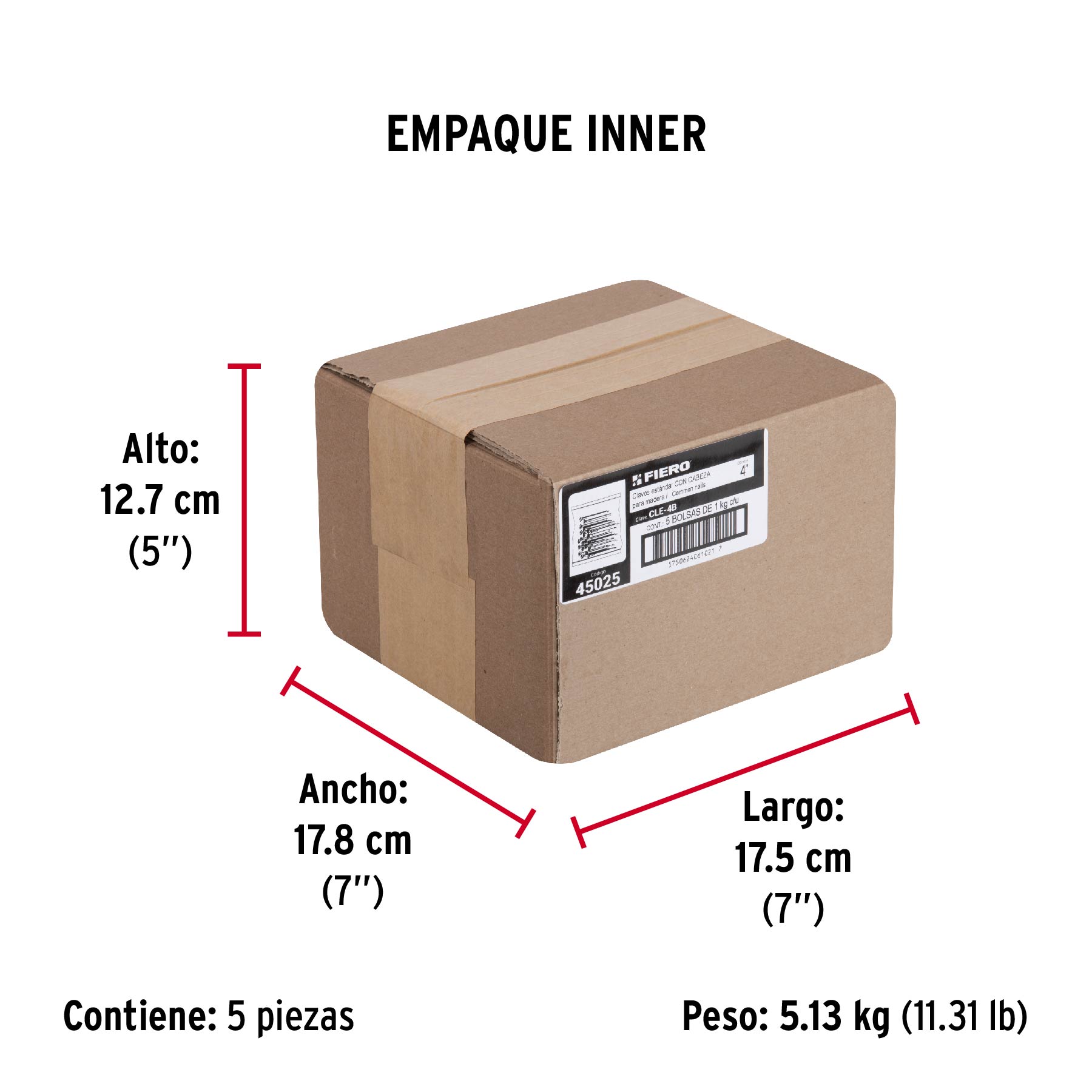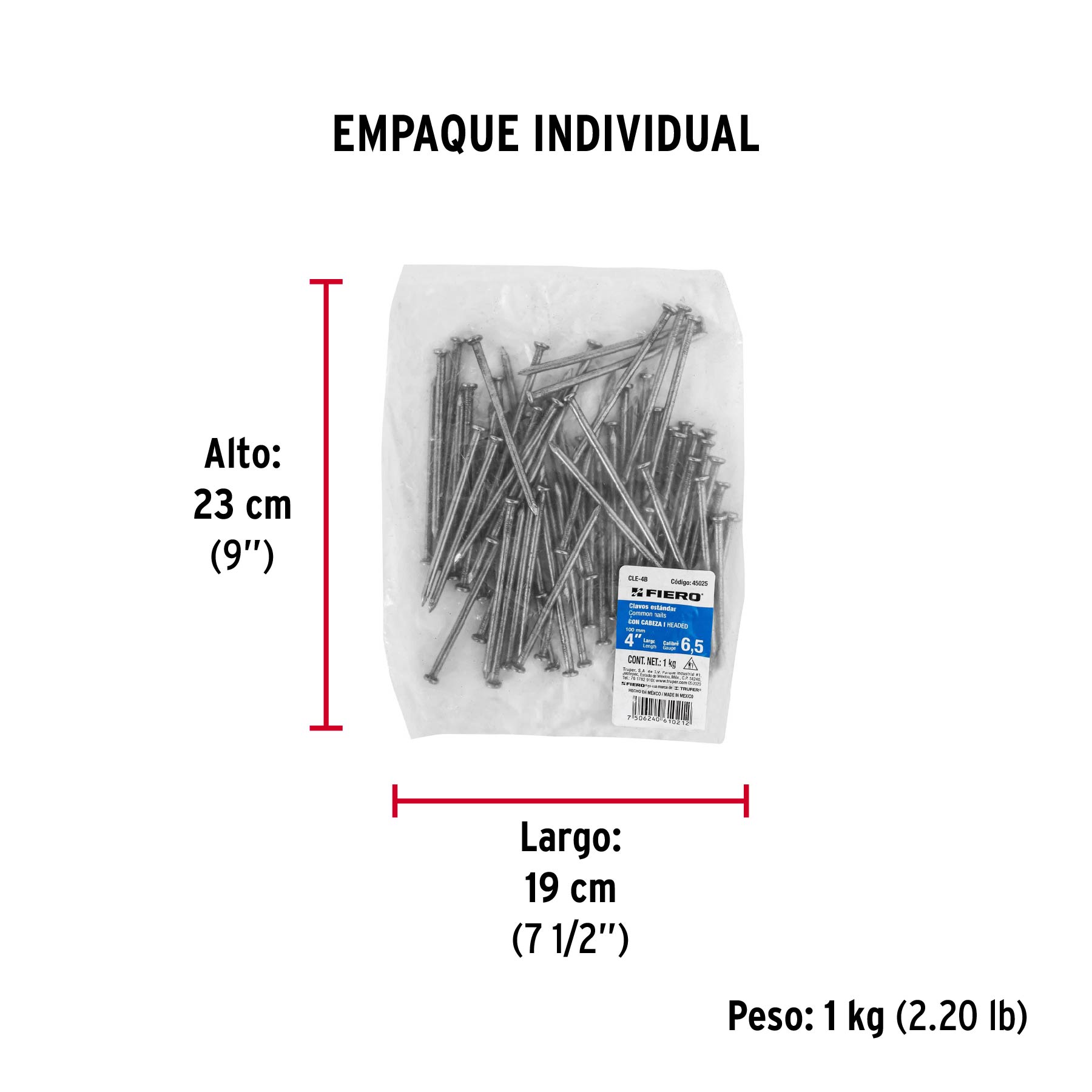 Bolsa con 1 kg de clavo estándar 4″ con cabeza, FIERO 45025